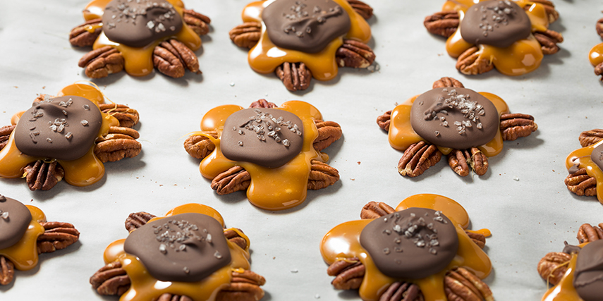 - To assemble the turtles: in a tray with parchment paper, place half a tablespoon of chocolate and make a circle forming the base, place three or four nuts, on top of them, add a teaspoon of melted caramel, and on top of it, more chocolate.